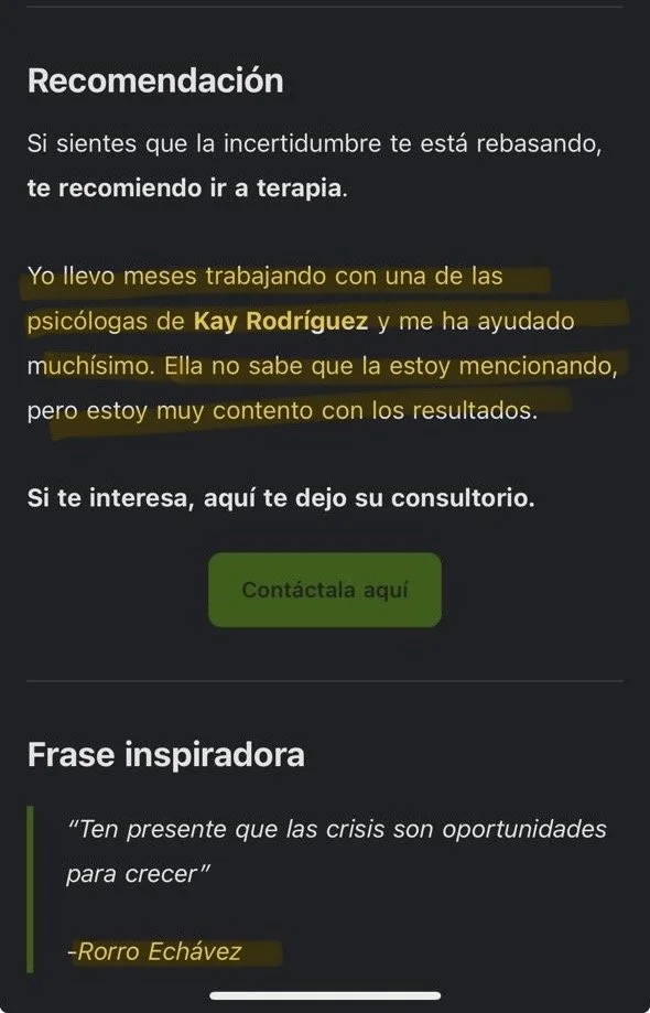 Mi tarifa es de $800.00 MXN por sesión, o su equivalente en tu moneda local, y cada sesión tiene una duración de 50 minutos.